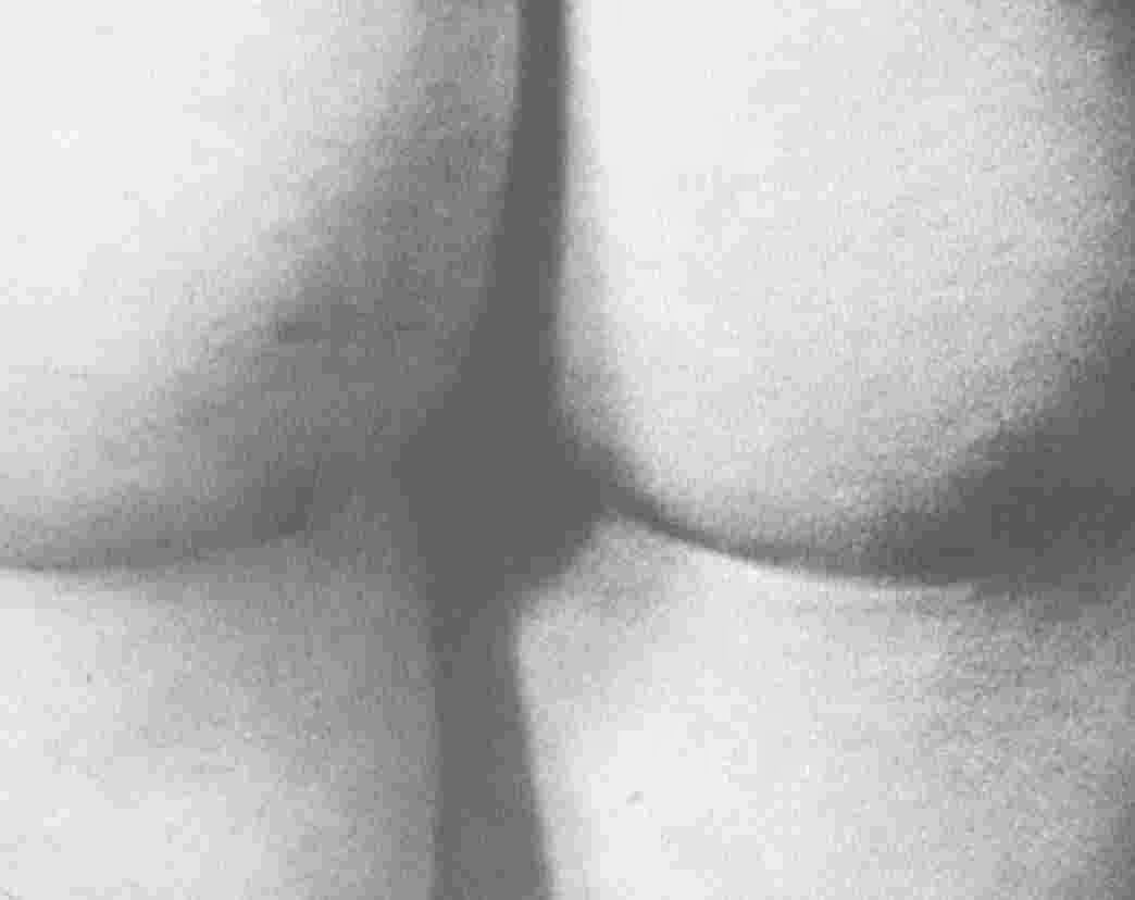 dangling testicles, dimpled buttocks,